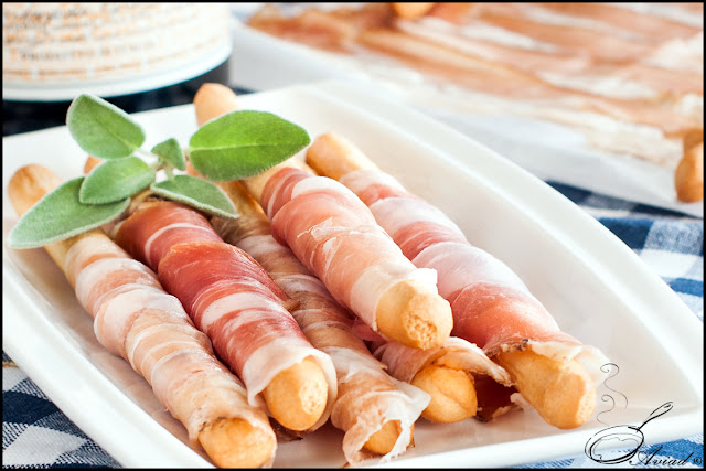 מקלות גריסיני פריכים אשר עליהם מגולגלים פרוסות פרשוטו איטלקי, חמצמץ, שמנוני ועדין.